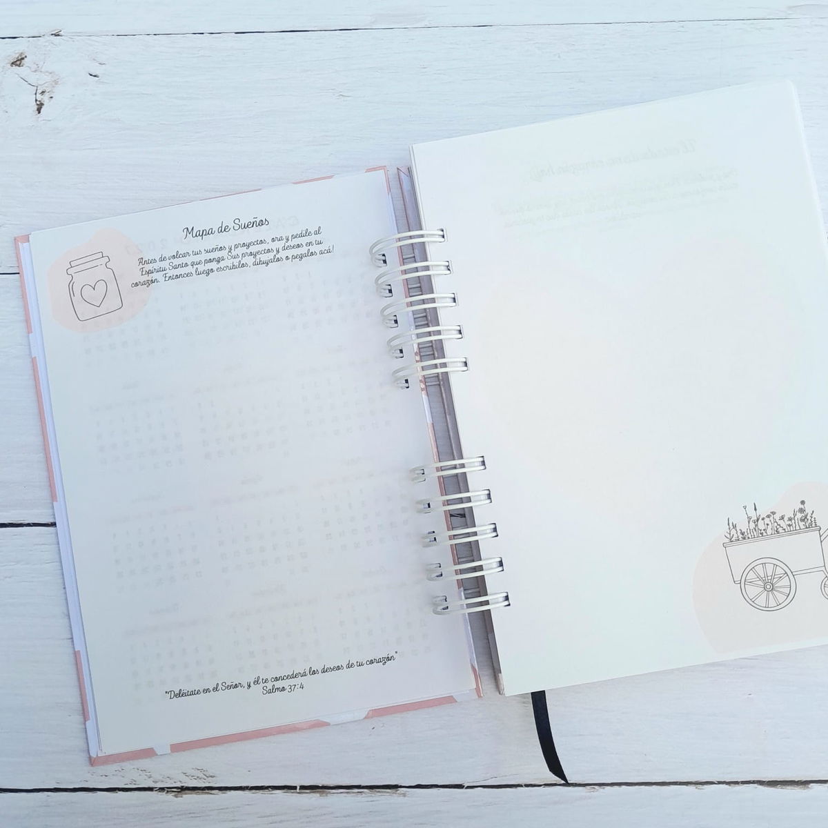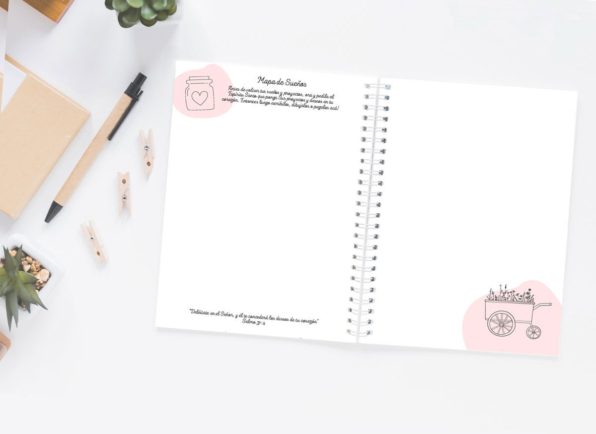 Esta agenda nació para recordarte, cada día, que tu corazón necesita un espacio de calma y de encuentro. Al abrirla, lo primero que vas a encontrar es la Palabra de Dios iluminando tu jornada, y páginas que te invitan a frenar, agradecer, orar y soñar en su presencia.