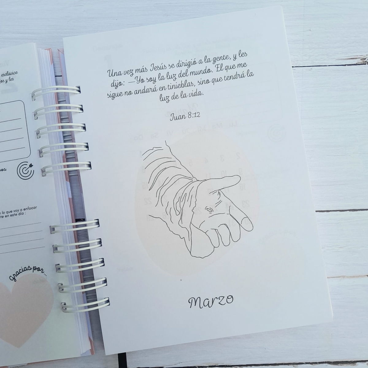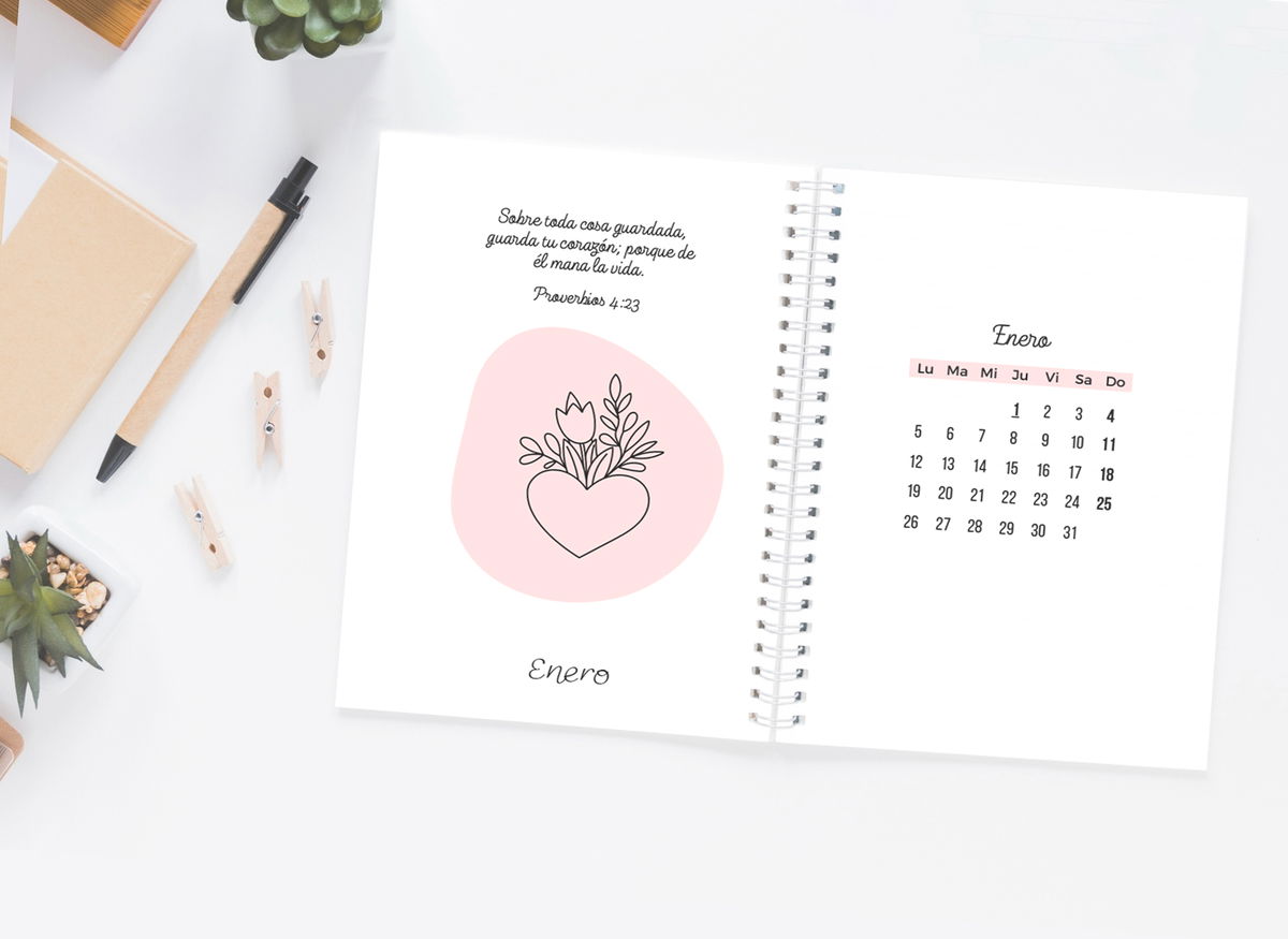 No es solo una agenda para organizar tareas: es una guía para organizar la vida desde adentro hacia afuera. Cada mes te acompaña con una temática distinta —amor, fe, confianza, sanidad, esperanza— y cada día un versículo especialmente elegido para ayudarte a profundizar en ese aspecto.