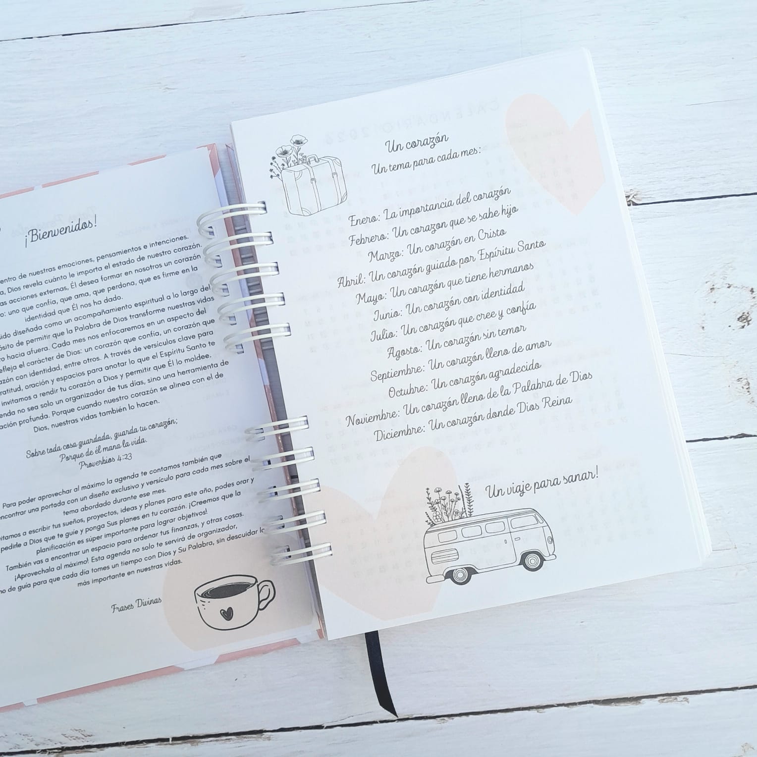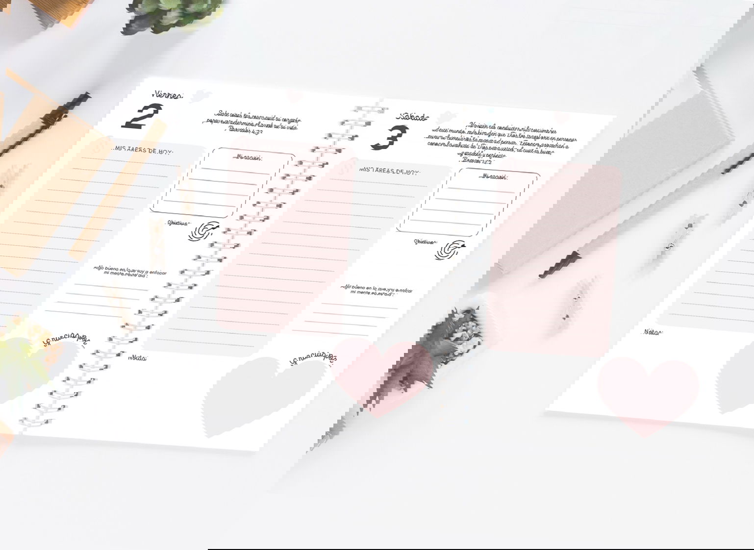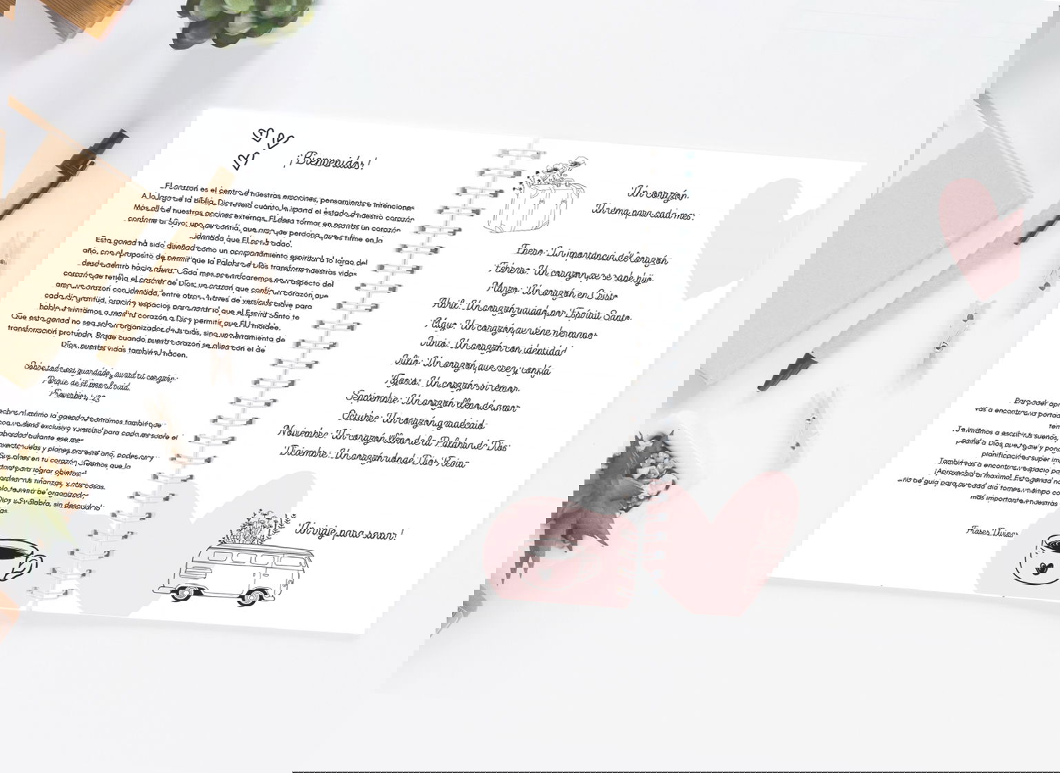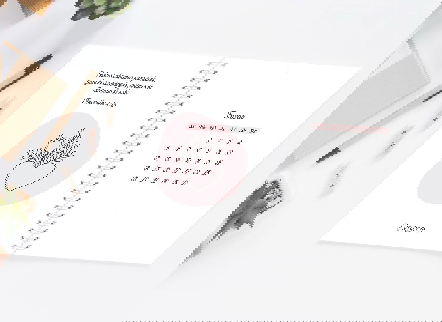 No es solo una agenda para organizar tareas: es una guía para organizar la vida desde adentro hacia afuera. Cada mes te acompaña con una temática distinta —amor, fe, confianza, sanidad, esperanza— y cada día un versículo especialmente elegido para ayudarte a profundizar en ese aspecto.