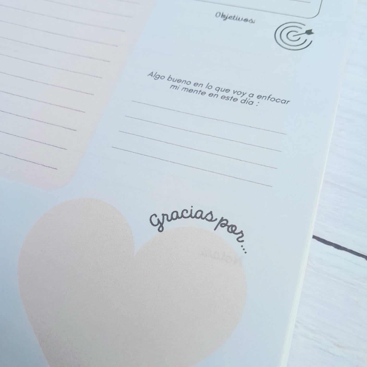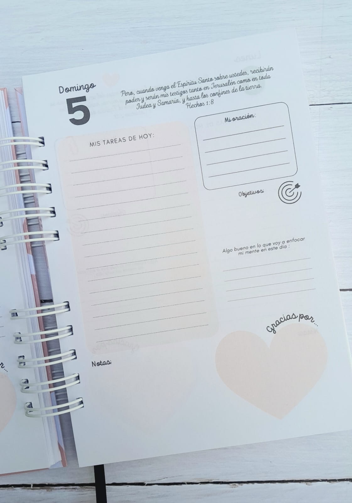 Espacio diario amplio para organizar tus tareas, oraciones y gratitud.
