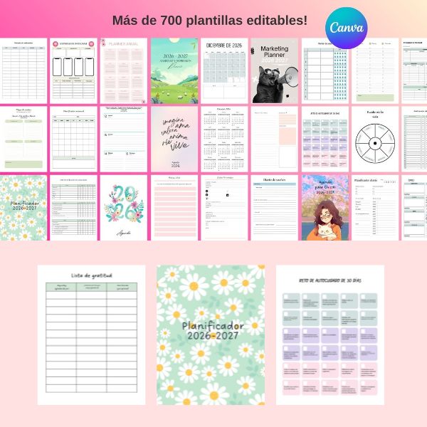 Organizá tus ideas, metas y proyectos con este Mega Pack de más de más de 15 agendas en español, completamente editables en Canva y listas para imprimir o personalizar a tu estilo.