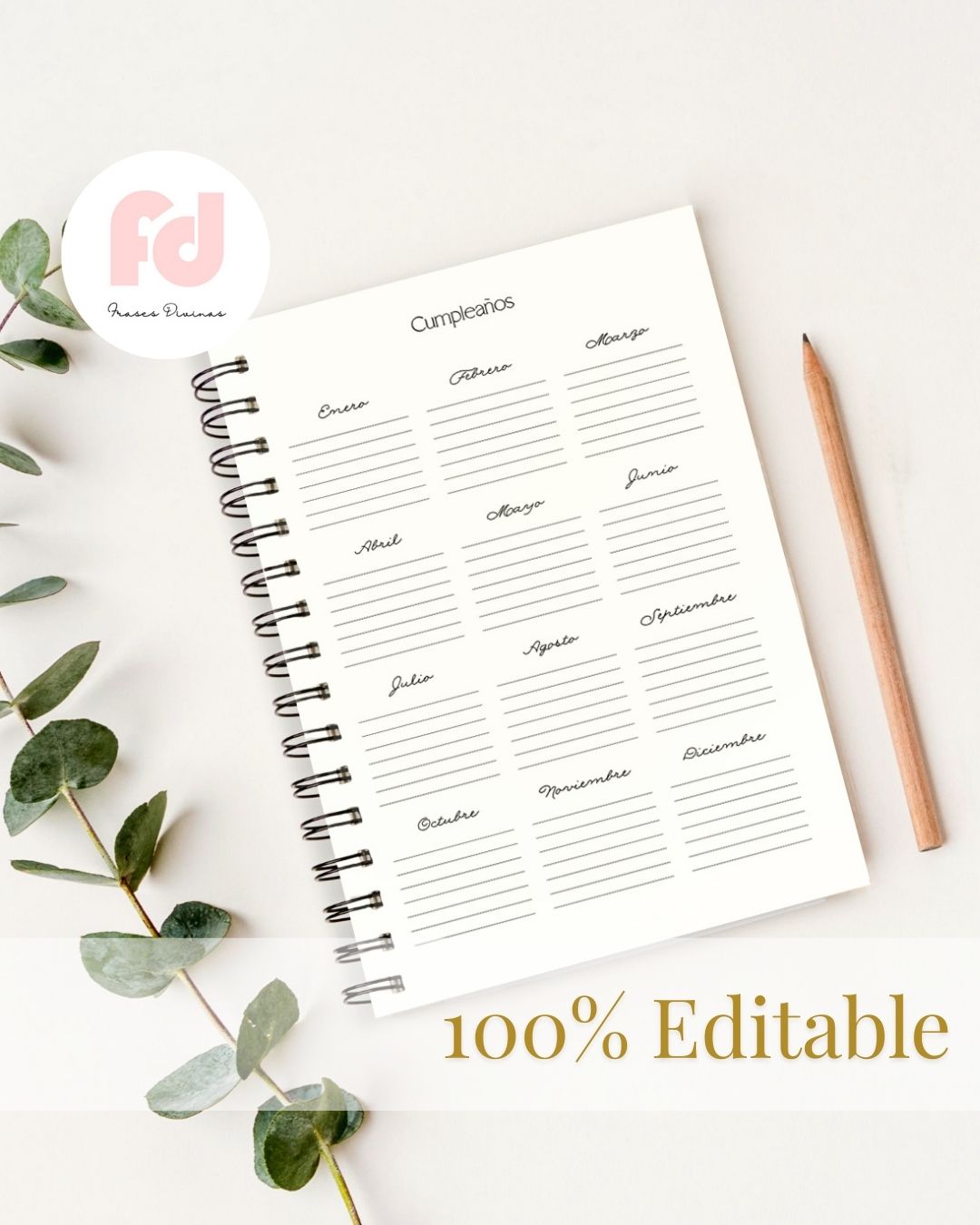 Es un archivo original de Canva que te permite abrirlo en este programa y modificar todo lo que quieras: tipografía, colores, agregar o sacar elementos, cambiar frases y hasta las fechas si queres usarla para otros años o hacerla perpetua.